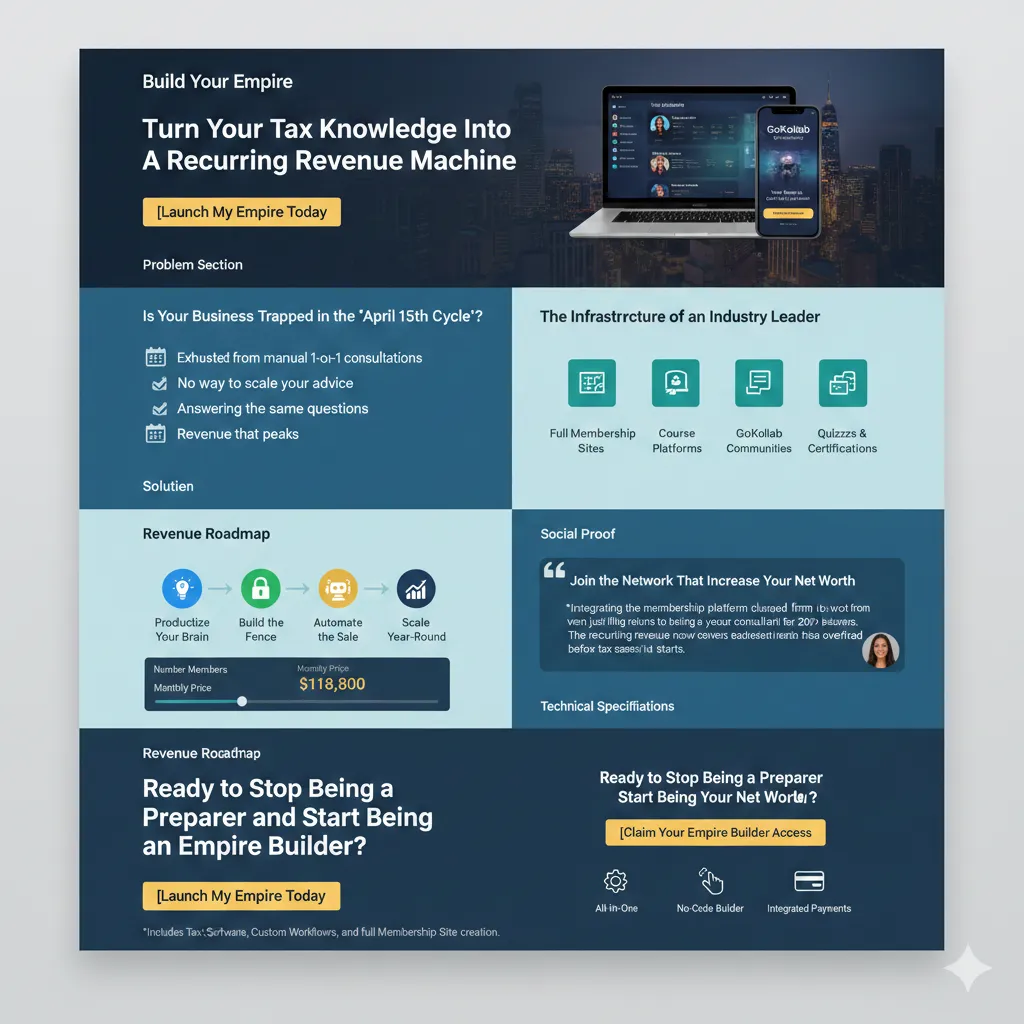 Course Platforms: Host video masterclasses on "Business Tax Secrets," "Wealth Management," or "Audit Protection" once and sell them forever.
