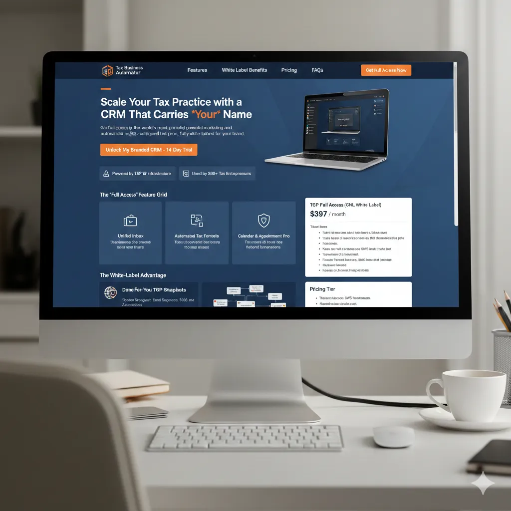 Get full access to the world’s most powerful marketing and automation engine. Pre-configured for tax pros, fully white-labeled for your brand. Stop paying for 10 different tools consolidate and dominate under TGP.