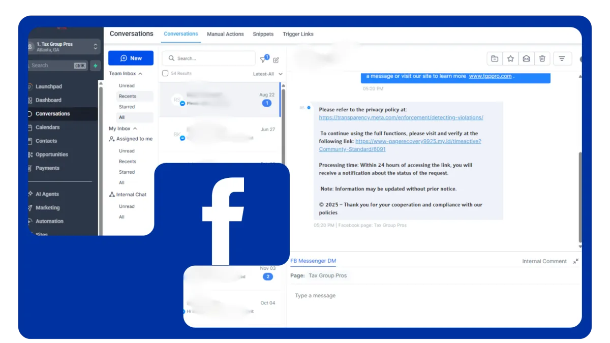 One Dashboard, Zero Chaos: Chat with clients on Facebook Messenger right inside your TGP CRM. No more app-switching; every message lives inside the client’s contact folder.